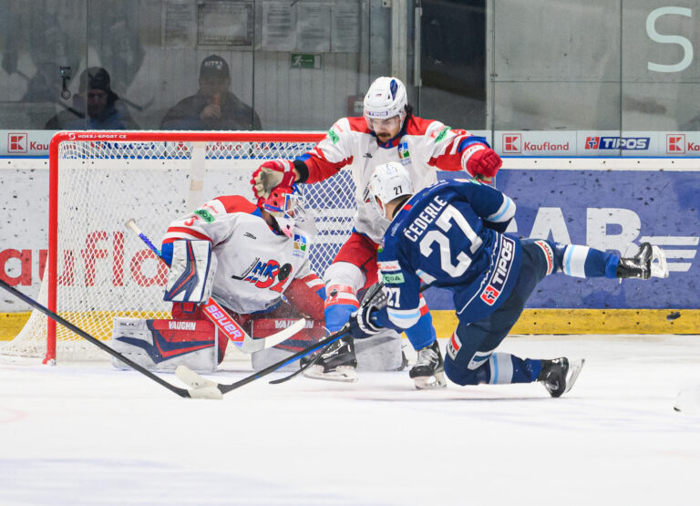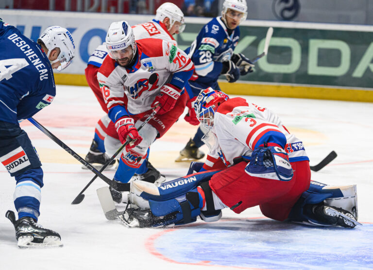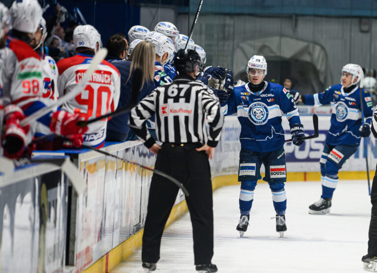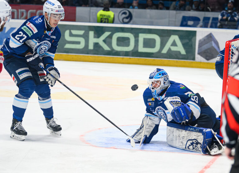 Zľava: Sebastián Čederle a brankár Libor Kašík, obaja z HK Nitra počas hokejového zápasu 48. kola Tipos extraligy 2024/2025 medzi HK Nitra - HK 32 Liptovský Mikuláš. Nitra, 16. február 2025. Foto: SITA/Martin Havran.