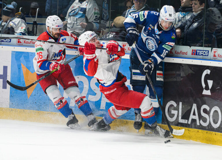 Zľava: Jaedon Descheneau z HK Nitra, Frederik Fekiač a brankár Filip Surák z HK 32 Liptovský Mikuláš počas hokejového zápasu 48. kola Tipos extraligy 2024/2025 medzi HK Nitra - HK 32 Liptovský Mikuláš. Nitra, 16. február 2025. Foto: SITA/Martin Havran.