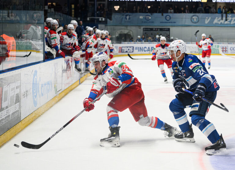Sebastián Čederle z HK Nitra (vpredu) počas hokejového zápasu 48. kola Tipos extraligy 2024/2025 medzi HK Nitra - HK 32 Liptovský Mikuláš. Nitra, 16. február 2025. Foto: SITA/Martin Havran.