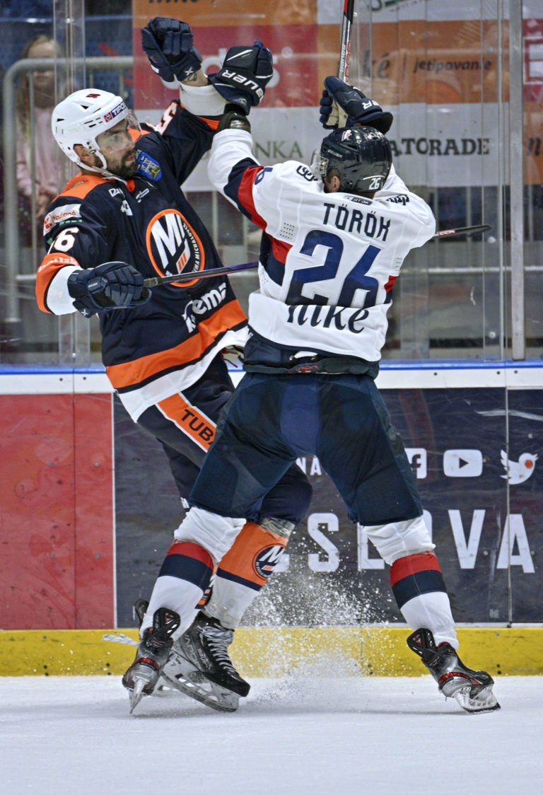 Obranca Vladimír Mihalík (HK Dukla Ingema Michalovce) a Tomáš Torok z HC Slovan Bratislava počas zápasu 1. kola Tipos extraligy 2023/2024. Bratislava, 15. september 2023. Foto: SITA/Milan Illík.