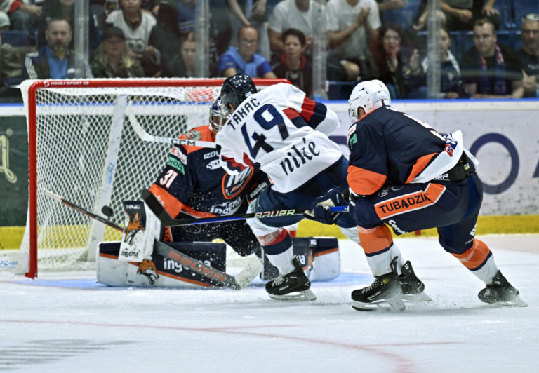 Útočník Samuel Takáč (HC Slovan Bratislava) sa snaží prekonať brankára Stanislava Škorvánka (HK Dukla Ingema Michalovce) počas zápasu 1. kola Tipos extraligy 2023/2024. Bratislava, 15. september 2023. Foto: SITA/Milan Illík.