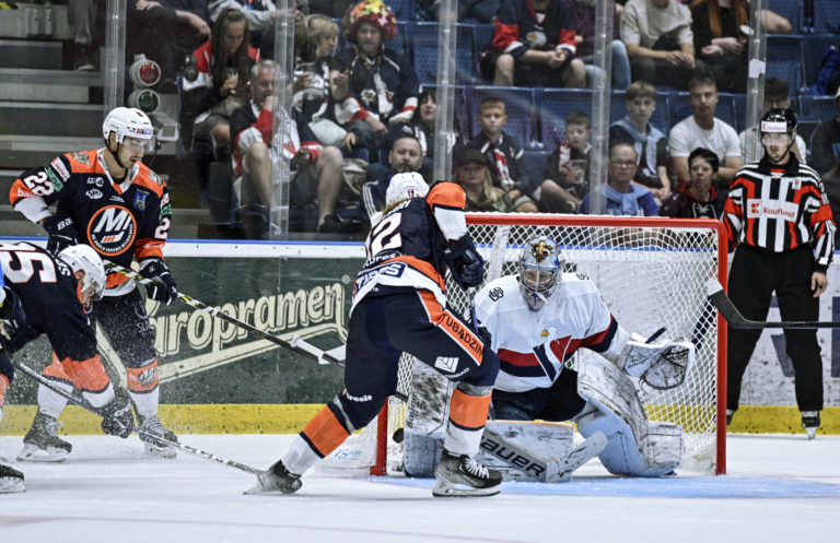 Chase Pearson strieľa ôsmy gól HK Dukla Ingema Michalovce v zápase 1. kola Tipos extraligy 2023/2024 proti HC Slovan Bratislava. Bratislava, 15. september 2023. Foto: SITA/Milan Illík.