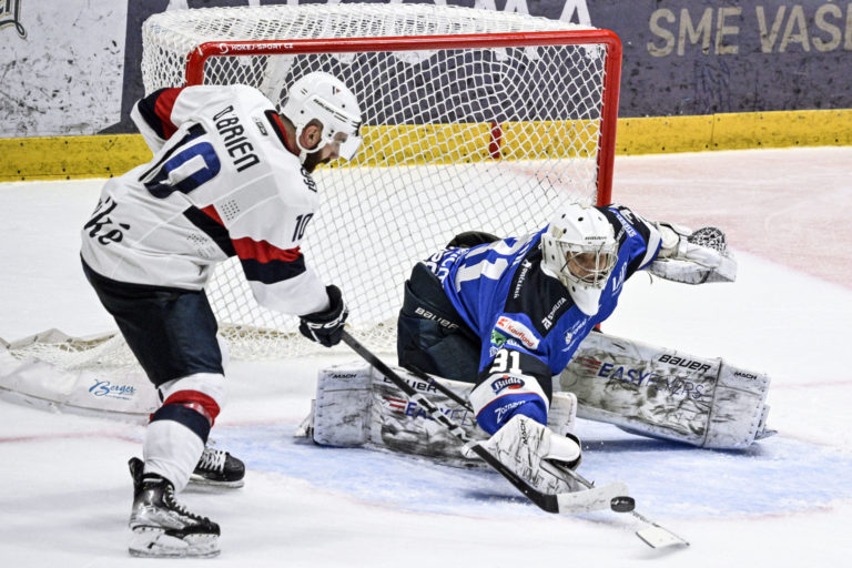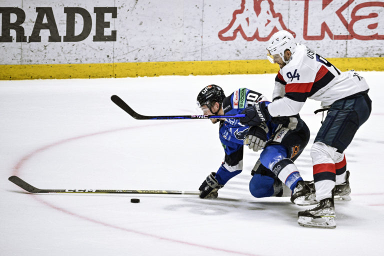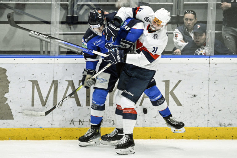 Zľava: Štefan Valluš a Garret Mc Fadden z HK Poprad počas hokejového zápasu 9. kola Tipos extraligy 2023/2024 medzi HC Slovan Bratislava - HK Poprad. Foto: archívne, SITA/Milan Illík