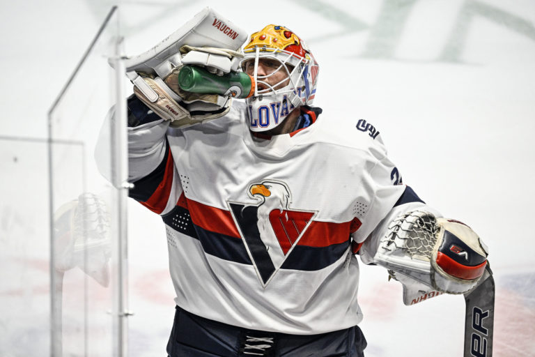 Brankár Jared Coreau z HC Slovan Bratislava počas hokejového zápasu 9. kola Tipos extraligy 2023/2024 medzi HC Slovan Bratislava - HK Poprad. Bratislava, 13. október 2023. Foto: SITA/Milan Illík