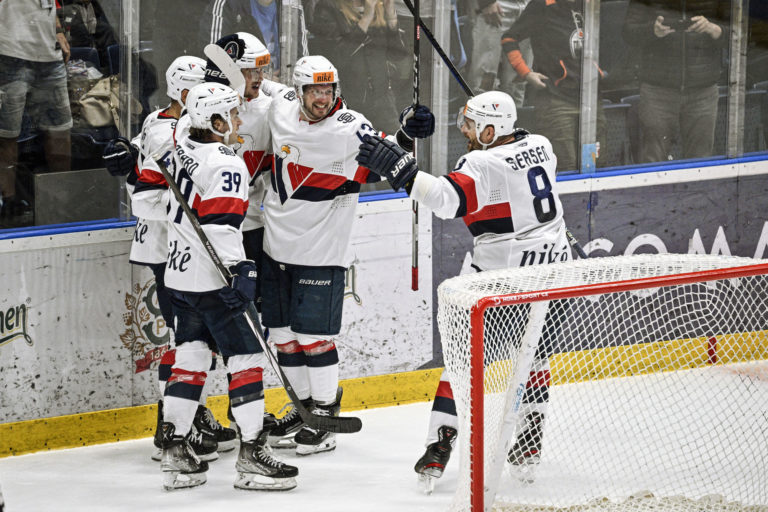 Radosť hráčov HC Slovan Bratislava po góle 5:2 počas hokejového zápasu 9. kola Tipos extraligy 2023/2024 medzi HC Slovan Bratislava - HK Poprad. Bratislava, 13. október 2023. Foto: SITA/Milan Illík