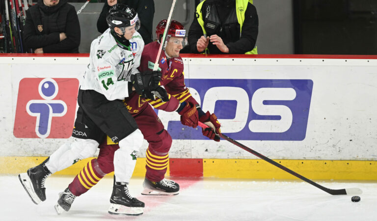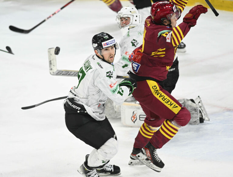 Sprava: Filip Ahl z HK Dukla Trenčín a Dominik Jendek z HC Nové Zámky počas 32. kola Tipos extraligy 2024/2025 medzi HK Dukla Trenčín - HC Nové Zámky. Trenčín, 28. december 2024. Foto: SITA/Tomáš Somr.
