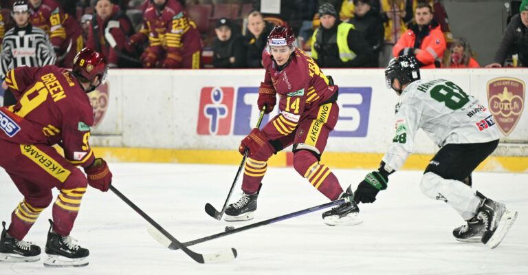 Zľava: Gordon Green, Andrej Krajčovič, obaja z HK Dukla Trenčín a Jayce Hawryluk z HC Nové Zámky počas 32. kola Tipos extraligy 2024/2025 medzi HK Dukla Trenčín - HC Nové Zámky. Trenčín, 28. december 2024. Foto: SITA/Tomáš Somr.