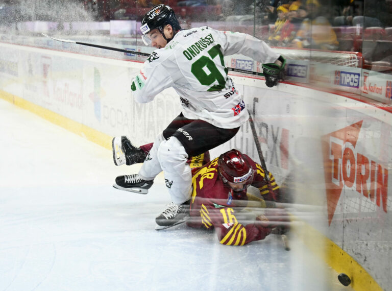 Sprava: Šimon Bečár z HK Dukla Trenčín a Richard Ondrušek z HC Nové Zámky počas 32. kola Tipos extraligy 2024/2025 medzi HK Dukla Trenčín - HC Nové Zámky. Trenčín, 28. december 2024. Foto: SITA/Tomáš Somr.