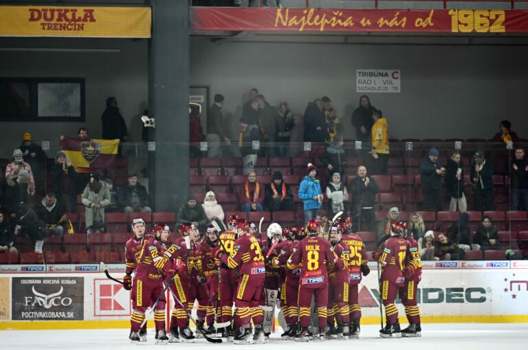 Hráči HK Dukla Trenčín sa radujú z víťazstva po skončení 32. kola Tipos extraligy 2024/2025 medzi HK Dukla Trenčín - HC Nové Zámky. Trenčín, 28. december 2024. Foto: SITA/Tomáš Somr.