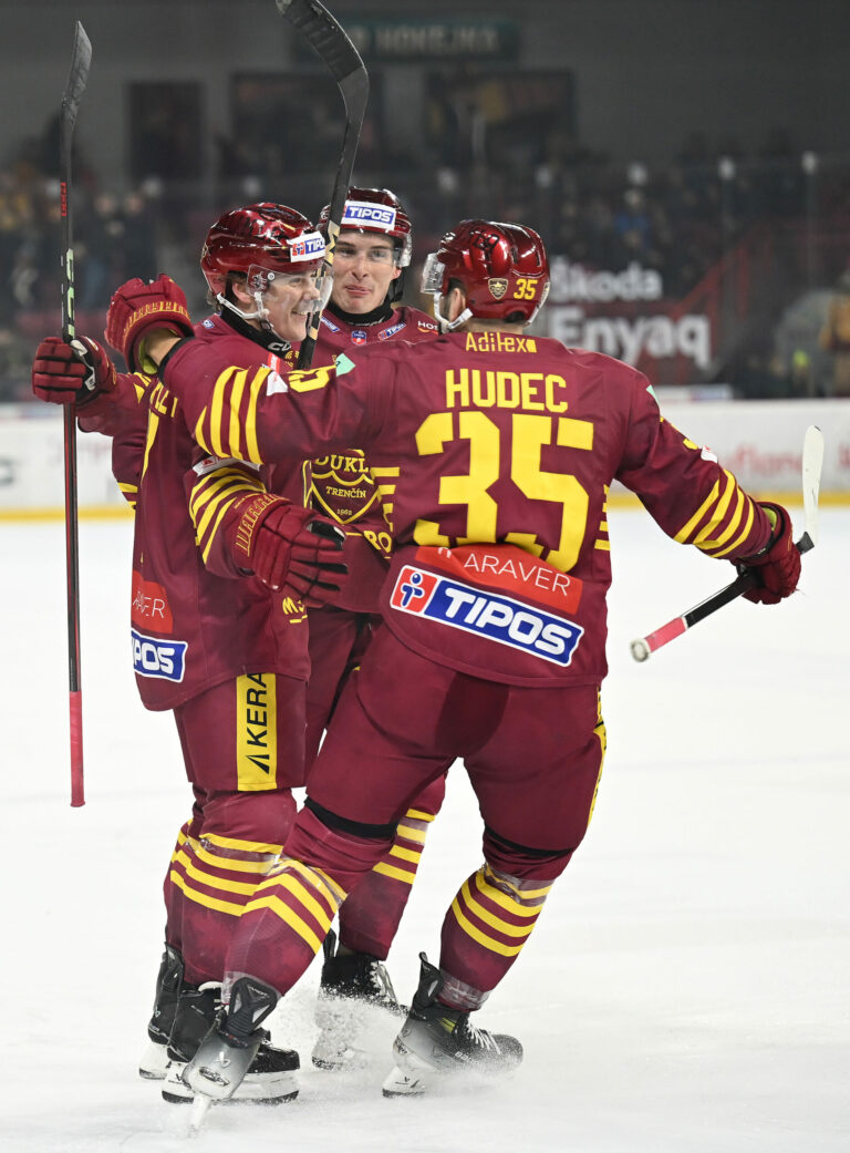 Zľava: Brett Stapley, Quinn Schmiemann a Denis Hudec, všetci z HK Dukla Trenčín sa radujú z gólu počas 32. kola Tipos extraligy 2024/2025 medzi HK Dukla Trenčín - HC Nové Zámky. Trenčín, 28. december 2024. Foto: SITA/Tomáš Somr.