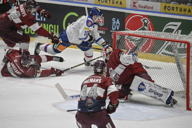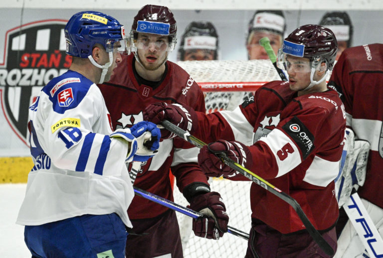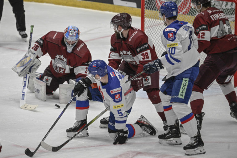 Zľava: Erks Vitols z Lotyšska,Patrik Bačík zo Slovenska, Haralds Egle z Lotyšska, Miroslav Mucha zo Slovenska a Miks Tumanovs z Lotyšska počas hokejového zápasu Vianočného Kaufland Cup medzi Slovensko - Nórsko. Bratislava, 15. december 2023. Foto: SITA/Milan Illík