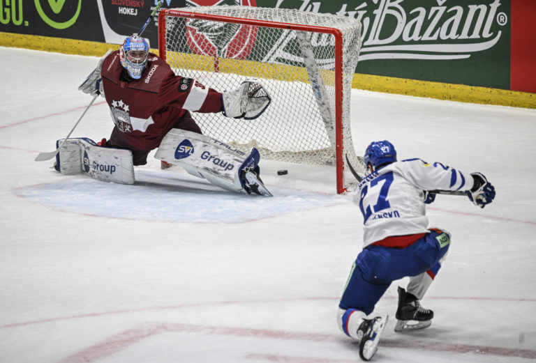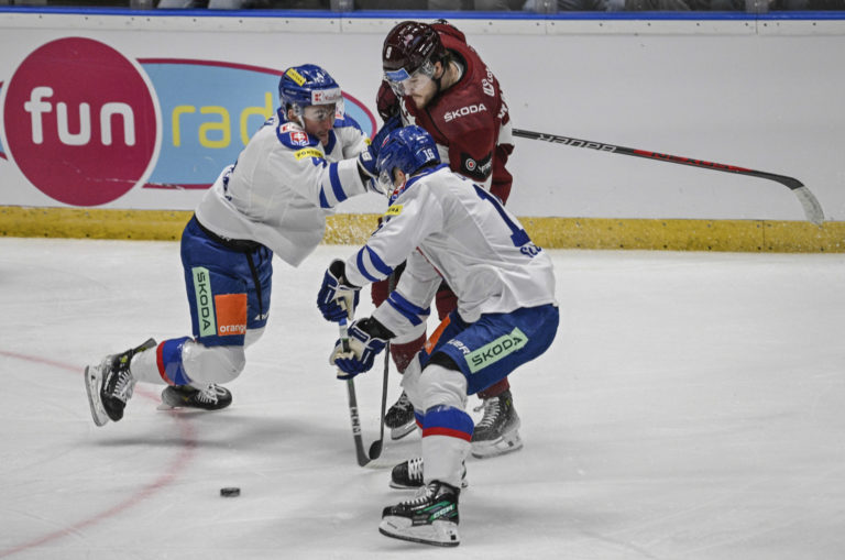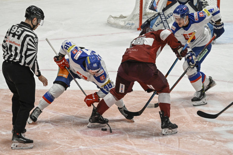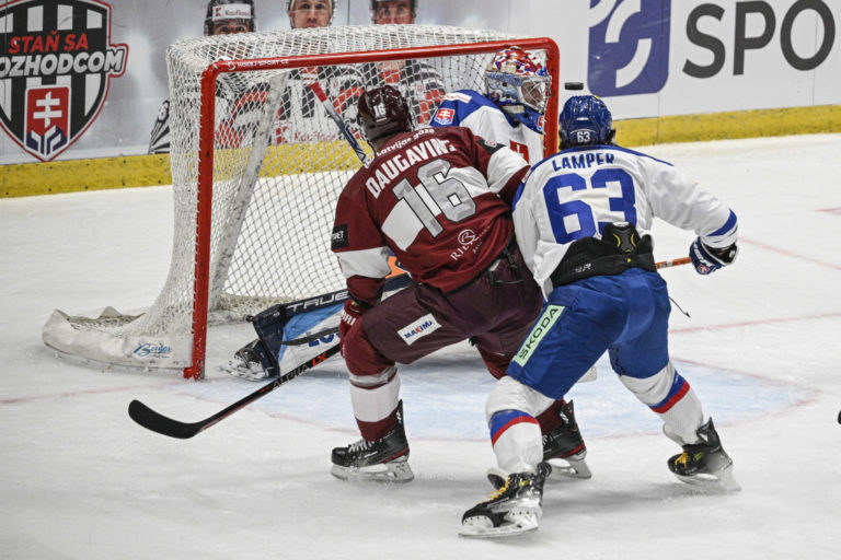 Zľava: Dávid Mudrák,Róbert Lantoš obaja zo Slovenska Renars Krastenbergs z Lotyšska počas hokejového zápasu Vianočného Kaufland Cup medzi Slovensko - Nórsko. Bratislava, 15. december 2023. Foto: SITA/Milan Illík