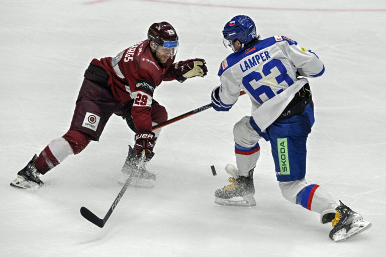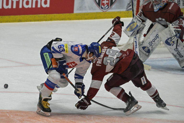 Zľava: Patrik Lambert zo Slovenska a Ralfs Freibergs z Lotyšska počas hokejového zápasu Vianočného Kaufland Cup medzi Slovensko - Nórsko. Bratislava, 15. december 2023. Foto: SITA/Milan Illík
