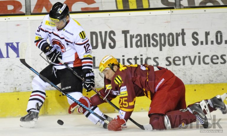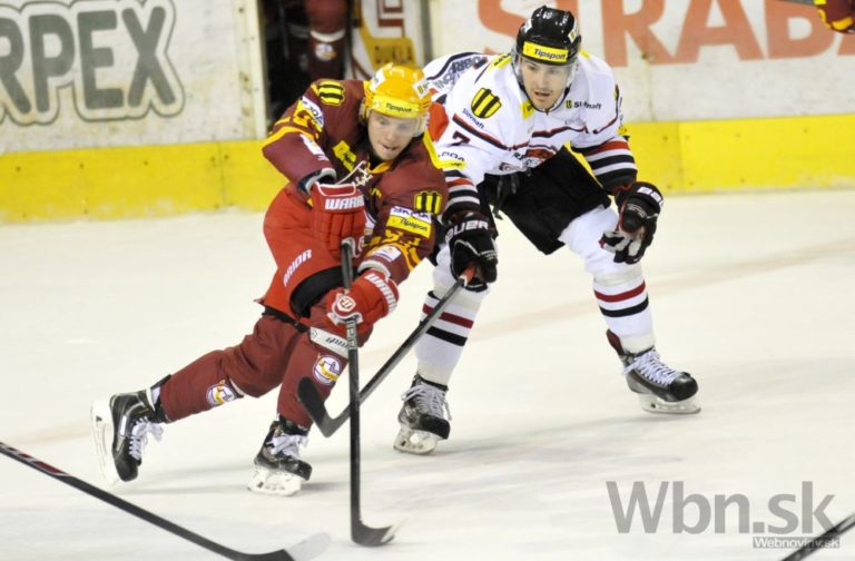 Zľava: Vladimír Nemec z Dukly Trenčín a Henrich Jaborník z HC´05 Banská Bystrica počas 11. kola hokejovej Tipsport extraligy medzi Dukla Trenčín a HC´05 Banská Bystrica. Trenčín, 10. október 2014. Foto: SITA/Tomáš Somr