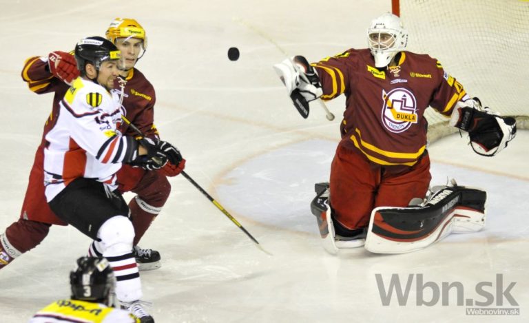 Zľava: Michal Hudec z HC´05 Banská Bystrica, Janis Andersons a Branislav Konrád z Dukly Trenčín počas 11. kola hokejovej Tipsport extraligy medzi Dukla Trenčín a HC´05 Banská Bystrica. Trenčín, 10. október 2014. Foto: SITA/Tomáš Somr