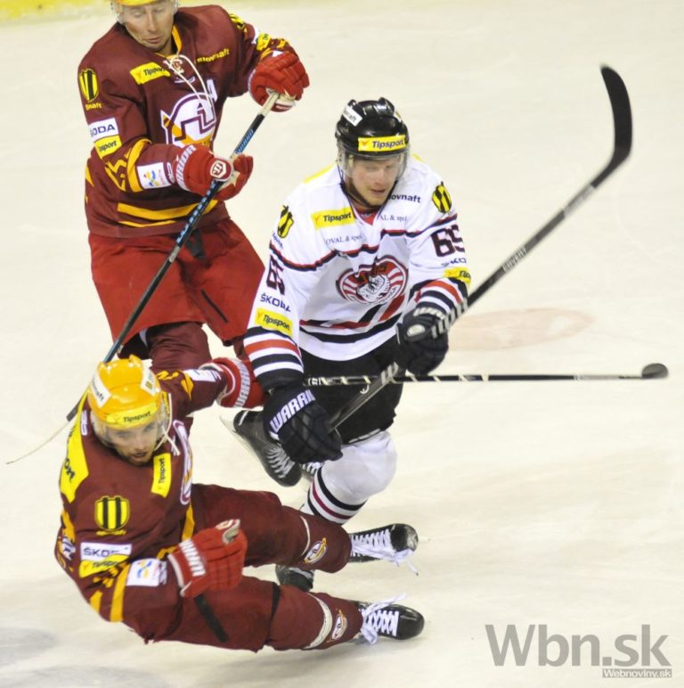 Tibor Melichárek (vľavo hore) z Dukly Trenčín, Tomáš Komínek (vľavo dole) a Miroslav Preisinger z HC´05 Banská Bystrica počas 11. kola hokejovej Tipsport extraligy medzi Dukla Trenčín a HC´05 Banská Bystrica. Trenčín, 10. október 2014. Foto: SITA/Tomáš Somr