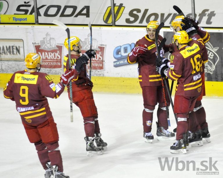Hráči Dukly Trenčín sa radujú z gólu počas 11. kola hokejovej Tipsport extraligy medzi Dukla Trenčín a HC´05 Banská Bystrica. Trenčín, 10. október 2014. Foto: SITA/Tomáš Somr