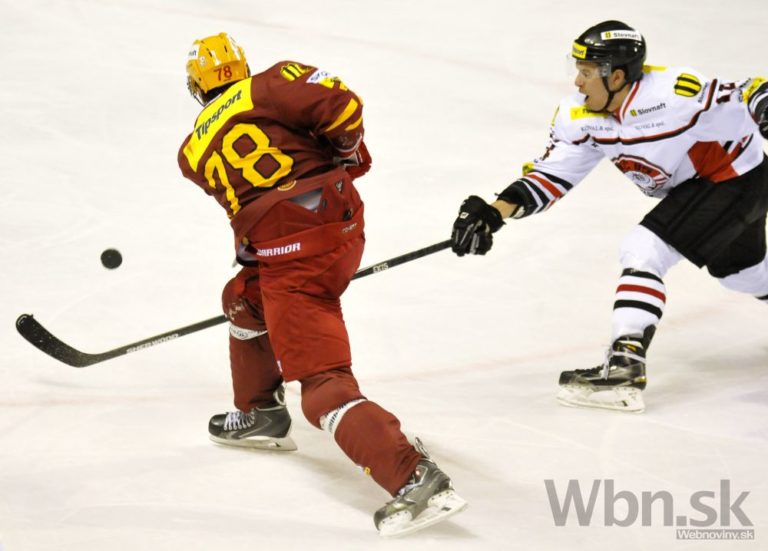 Zľava: Peter Šišovský z Dukly Trenčín a Patrik Lamper z HC´05 Banská Bystrica počas 11. kola hokejovej Tipsport extraligy medzi Dukla Trenčín a HC´05 Banská Bystrica. Trenčín, 10. október 2014. Foto: SITA/Tomáš Somr