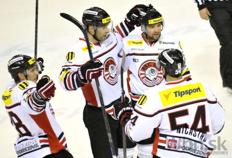 Hráči HC´05 Banská Bystrica sa radujú z gólu počas 11. kola hokejovej Tipsport extraligy medzi Dukla Trenčín a HC´05 Banská Bystrica. Trenčín, 10. október 2014. Foto: SITA/Tomáš Somr