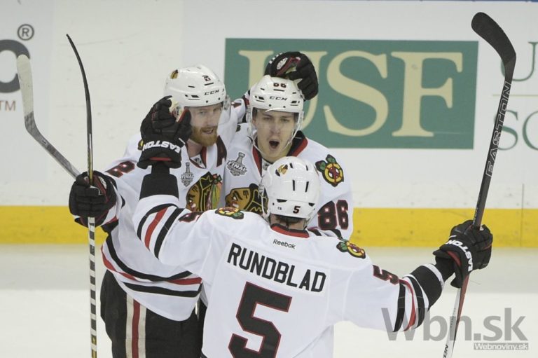 Hráči Chicaga oslavujú víťazstvo nad Tampa Bay počas prvého finálového zápasu Stanleyho pohára. Tampa, 4. júna 2015. Foto: SITA/AP