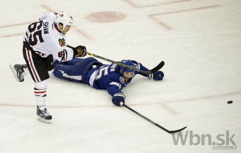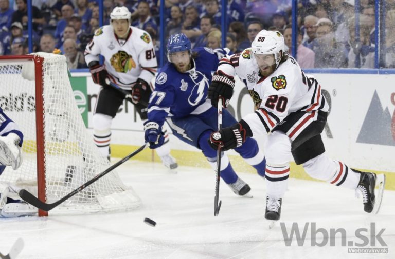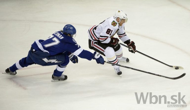 Slovenský hokejista Chicaga Marián Hossa sa snaží uniknúť hráčovi Tampa Bay Victorovi Hedmanovi v prvej tretine zápasu. Tampa, 4. júna 2015. Foto: SITA/AP