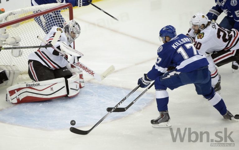 Zľava: gólman Chicaga Corey Crawford dostáva gól od hráča Tampa Bay Alexa Killorna počas prvého finále Stanleyho pohára. Tampa, 4. júna 2015. Foto: SITA/AP