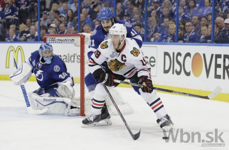 Hráč Chicaga Jonathan Toews korčuľuje pred bránou brankára Tampa Bay Bena Bishopa počas prvého finále Stanleyho pohára. Tampa, 4. júna 2015. Foto: SITA/AP