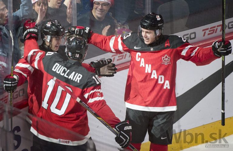 Pohľad na hráčov Kanady Robbyho Fabbriho (vľavo), Anthonyho Duclaira a Sama Reinharta (vpravo), ktorí sa tešia z gólu do bránky Slovenska počas prvej tretiny zápasu juniorského šampionátu v hokeji. Kanada, Montreal, 26. decembra 2014. Foto: SITA/AP