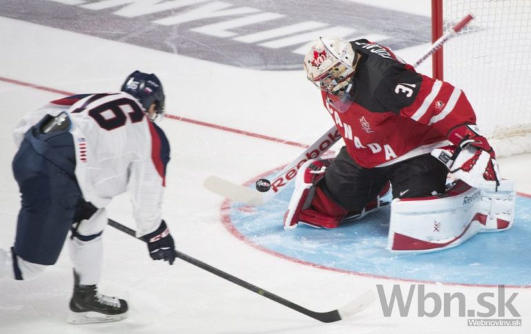Kanadský gólman do 20 rokov Zach Fucale chytá strelu Slováka Roberta Lantošiho počas prvej tretiny zápasu juniorského šampionátu v hokeji. Kanada, Montreal, 26. decembra 2014. Foto: SITA/AP