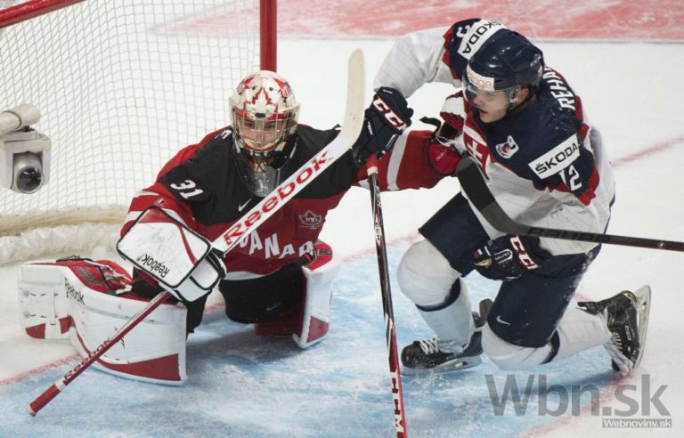 Kanadský gólman Zach Fucale odtláča strelu slovenského hráča Dominika Reháka počas druhej tretiny zápasu juniorského šampionátu v hokeji. Kanada, Montreal, 26. decembra 2014. Foto: SITA/AP