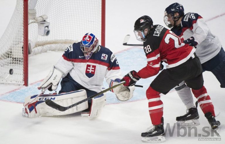 Slovenský gólman Dávid Okoličány sa bráni strele od Kanaďana Lawsoan Crousa (28), ktorého bráni slovenský obranca Christián Jaroš počas tretej tretiny zápasu juniorského šampionátu v hokeji. Kanada, Montreal, 26. decembra 2014. Foto: SITA/AP