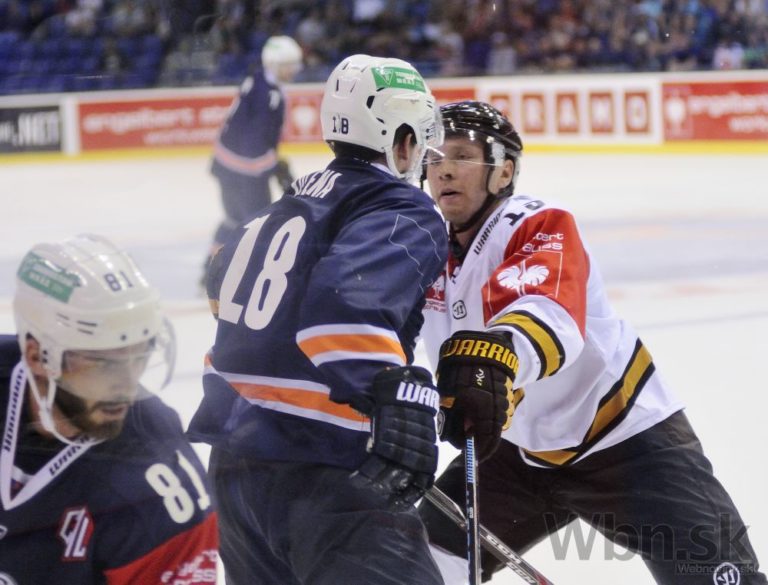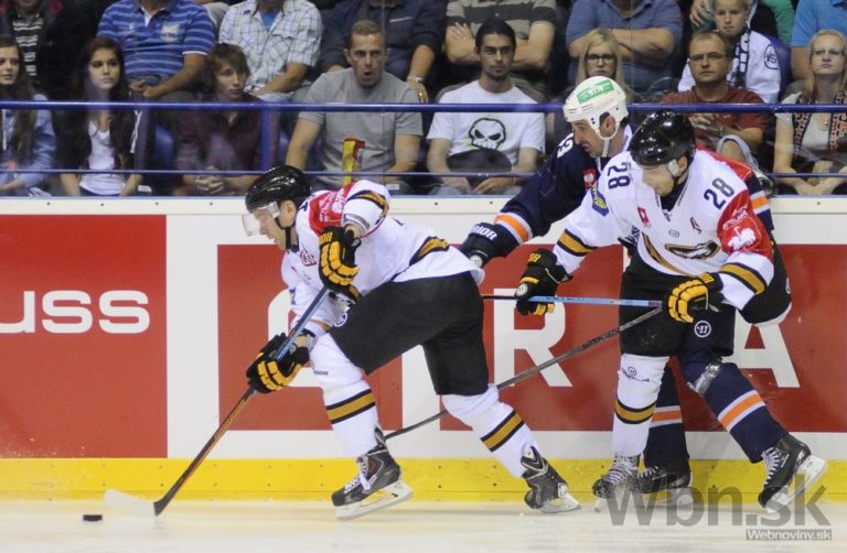 Zľava: Richard Jenčík z Košíc a Mika Pyorälä z Oulu v zápase 2. kola A-skupiny Ligy majstrov medzi HC Košice - Kärpät Oulu (Fínsko). Košice, 23. august 2014. Foto: SITA/Jozef Jarošík
