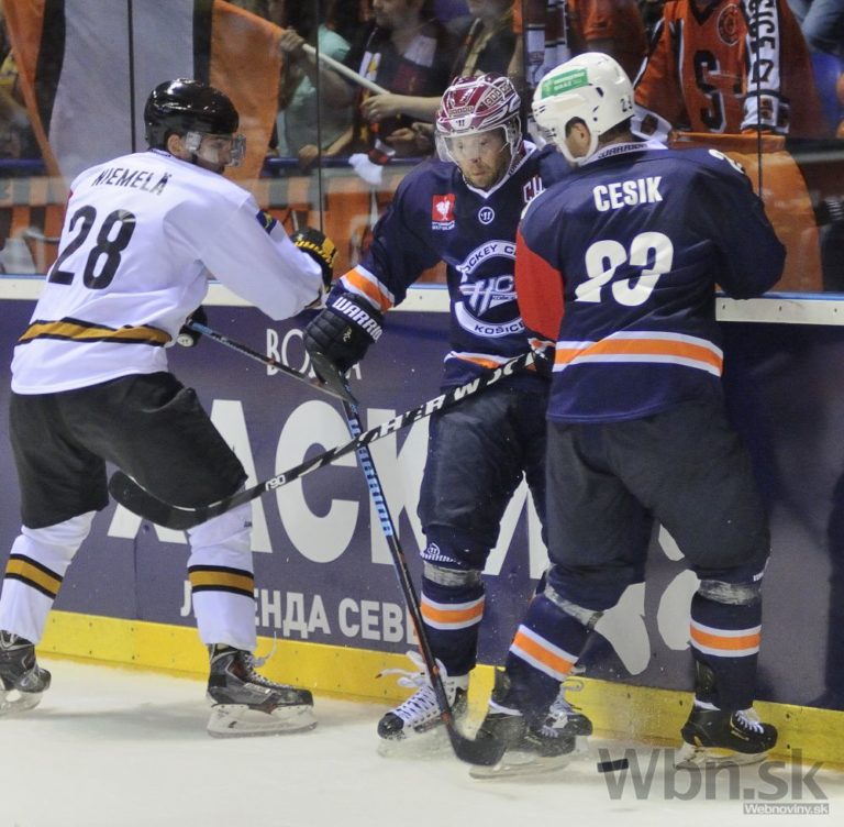 Zľava: Mikko Niemelä z Oulu, Jiří Bicek a Matej Češík z Košíc v zápase 2. kola A-skupiny Ligy majstrov medzi HC Košice - Kärpät Oulu (Fínsko). Košice, 23. august 2014. Foto: SITA/Jozef Jarošík