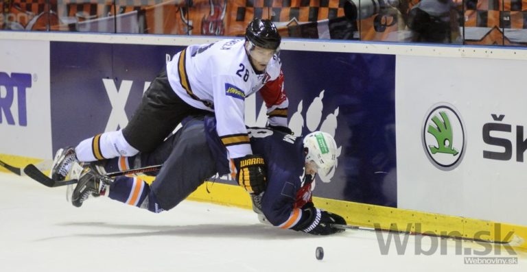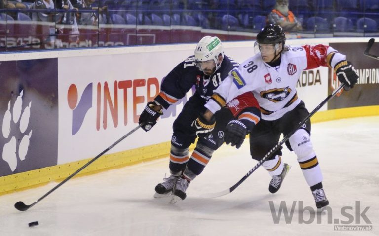 Zľava: Adam Lapšanský z Košíc a Adam Masuhr z Oulu v zápase 2. kola A-skupiny Ligy majstrov medzi HC Košice - Kärpät Oulu (Fínsko). Košice, 23. august 2014. Foto: SITA/Jozef Jarošík