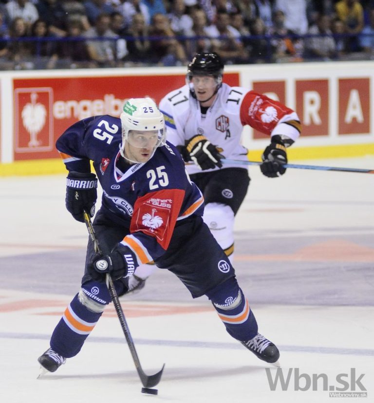 Zľava: Joonas Komulainen Kärpät Oulu z Fínska a Marek Zagrapan z Košíc v zápase 2. kola A-skupiny Ligy majstrov medzi HC Košice - Kärpät Oulu (Fínsko). Košice, 23. august 2014. Foto: SITA/Jozef Jarošík