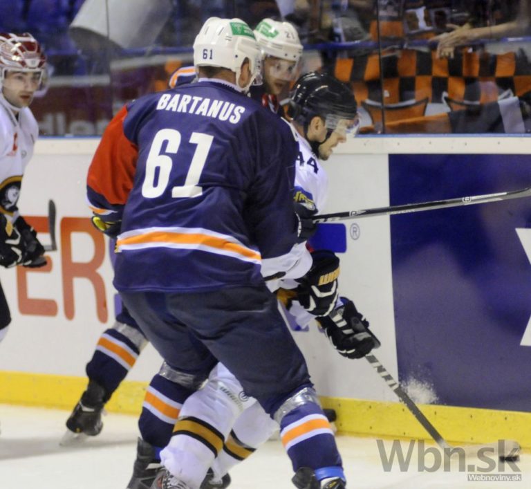 Marek Bartánus z Košíc (v popredí) a Ryan Glenn z Fínska (vpravo) v zápase 2. kola A-skupiny Ligy majstrov medzi HC Košice - Kärpät Oulu (Fínsko). Košice, 23. august 2014. Foto: SITA/Jozef Jarošík