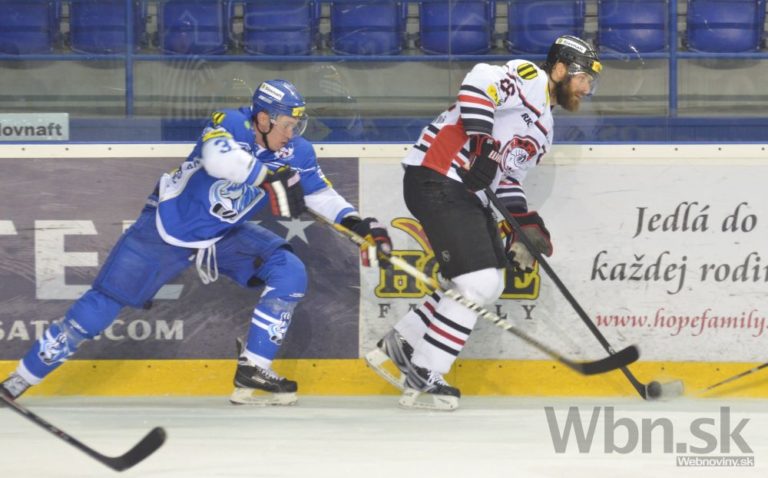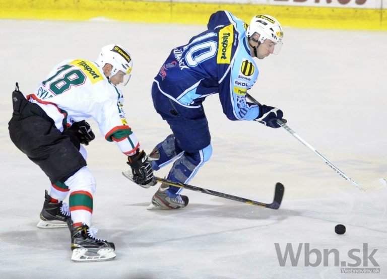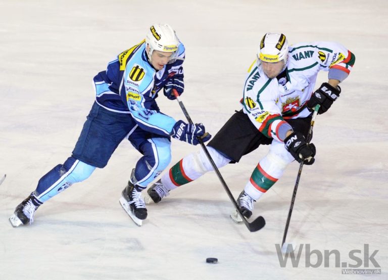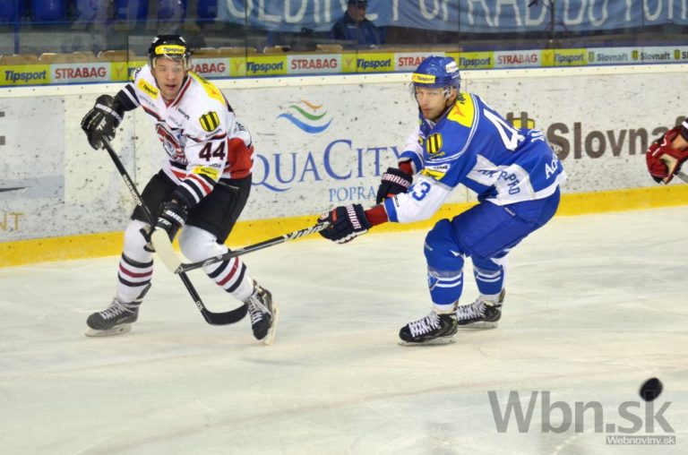 Matúš Matis z HK Poprad (vľavo) a Mislav Rosandič z HC ´05 Banská Bystrica (vpravo) počas zápasu 44. kola Tipsport extraligy HK Poprad – HC ´05 Banská Bystrica. Poprad, 25. január 2015. Foto: SITA/Radoslav Maťaš
