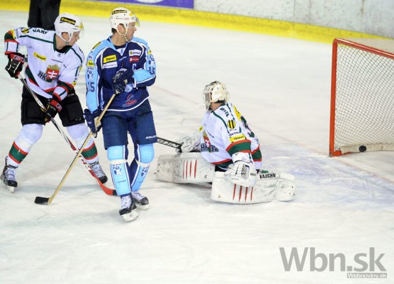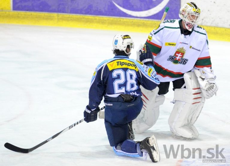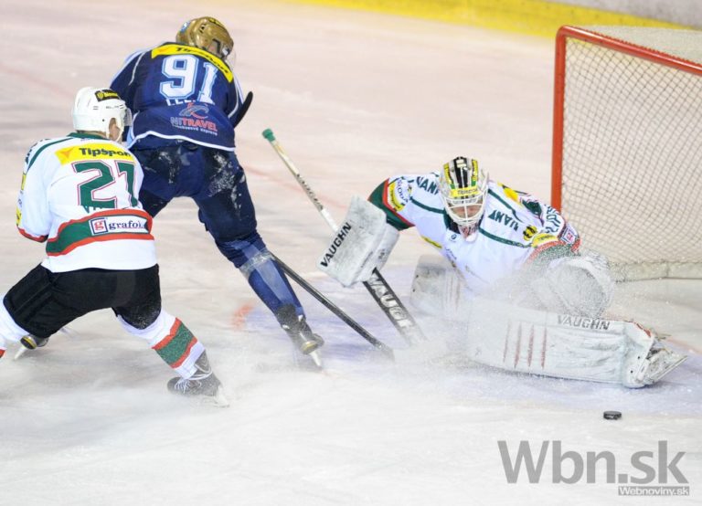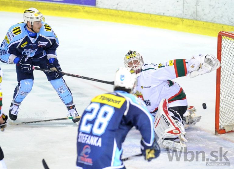 Juraj Štefanka z HK Nitra (vľavo) a brankár Miroslav Lipovský z HK 36 Hant Skalica (vpravo) počas 44. kola slovenskej hokejovej Tipsport extraligy 2014/2015 medzi HK Nitra - HK 36 Hant Skalica. Nitra, 25. január 2015. Foto: SITA/Martin Havran