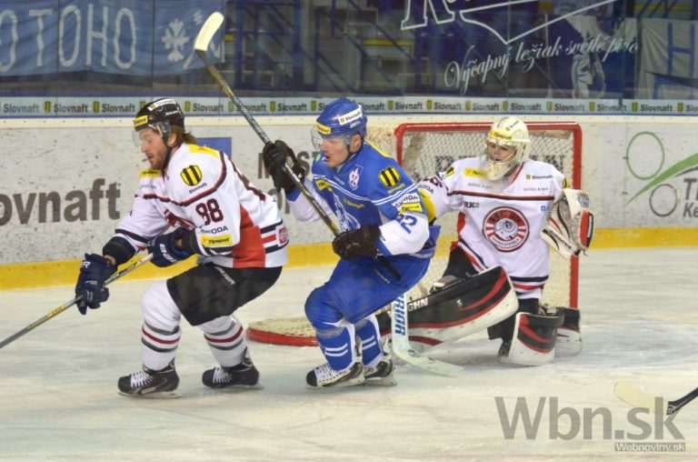 Zľava: Patrick White HC ´05 Banská Bystrica, Lukáš Hvila z HK Poprad a Andrej Košarišťan z HC ´05 Banská Bystrica počas zápasu 44. kola Tipsport extraligy HK Poprad – HC ´05 Banská Bystrica. Poprad, 25.január 2015. Foto: SITA/Radoslav Maťaš