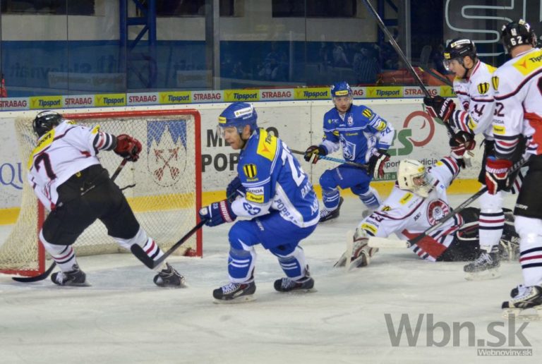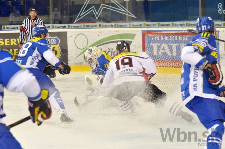 Matúš Kostúr z HK Poprad (uprostred vľavo) a Milan Kytnár z HC ´05 Banská Bystrica (uprostred vpravo) počas zápasu 44. kola Tipsport extraligy HK Poprad – HC ´05 Banská Bystrica. Poprad, 25.január 2015. Foto: SITA/Radoslav Maťaš
