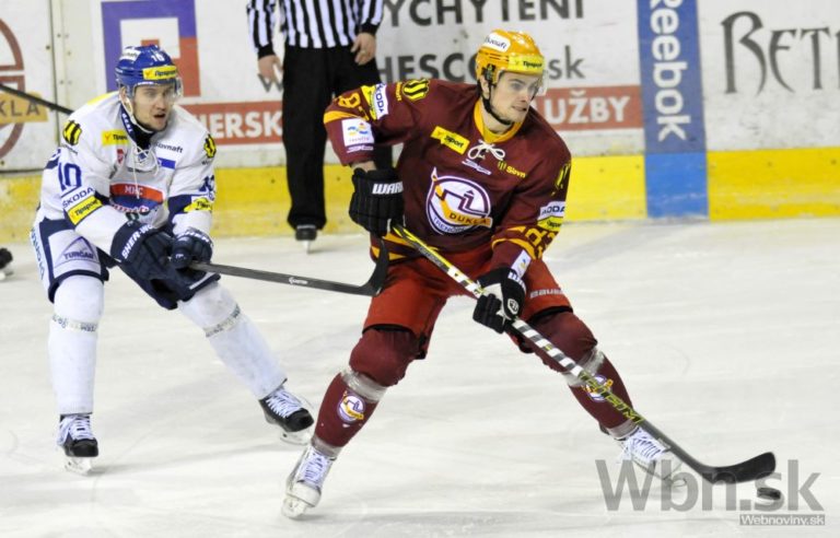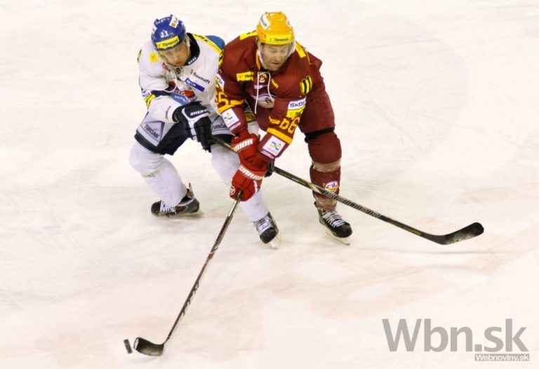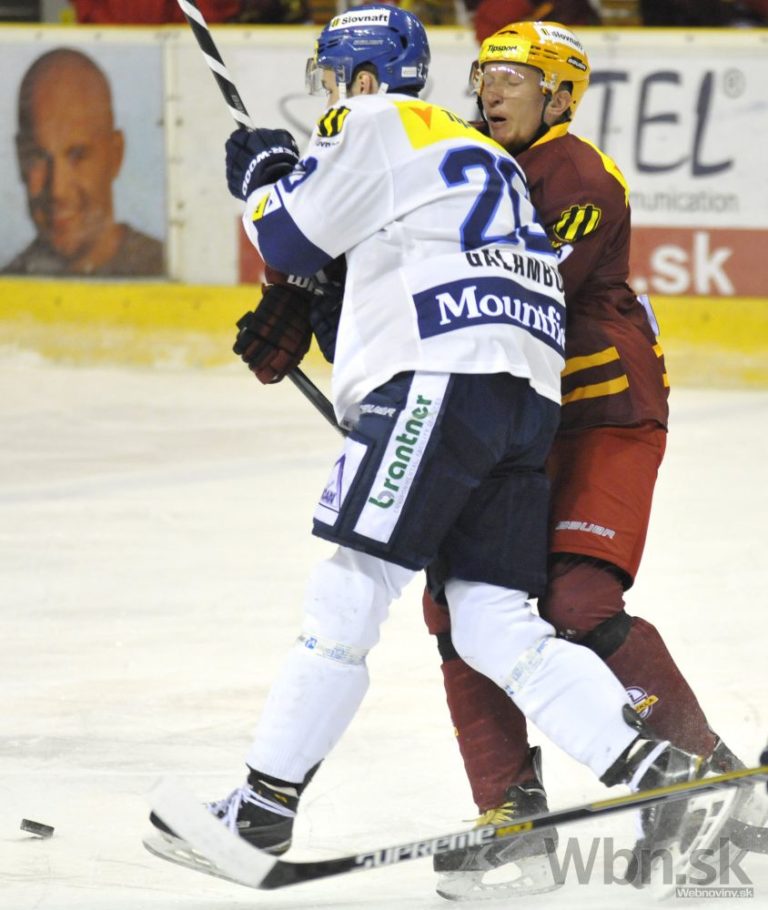 Zľava: Marcel Hossa z Dukly Trenčín a Peter Galamboš z MHC Mountfield Martin počas 44. kola hokejovej Tipsport extraligy medzi Dukla Trenčín a MHC Mountfield Martin. Trenčín, 25. január 2015. Foto: SITA/Tomáš Somr