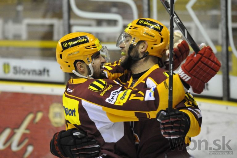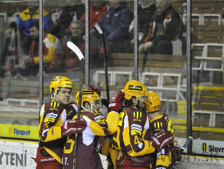 Hráči Dukly Trenčín sa radujú z gólu počas hokejového zápasu 44. kola Tipsport extraligy medzi Dukla Trenčín a MHC Mountfield Martin. Trenčín, 26. január 2014. Foto: SITA/Tomáš Somr