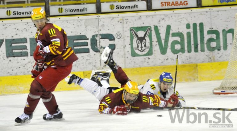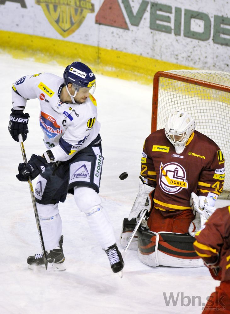 Sprava: Tomaž Razingar z Dukly Trenčín a Tomáš Brcko z MHC Mountfield Martin počas 44. kola hokejovej Tipsport extraligy medzi Dukla Trenčín a MHC Mountfield Martin. Trenčín, 25. január 2015. Foto: SITA/Tomáš Somr