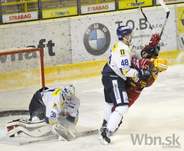 Zľava: Tibor Melichárek a Andrej Hatala z Dukly Trenčín, Dominik Fujerík z MHC Mountfield Martin počas 44. kola hokejovej Tipsport extraligy medzi Dukla Trenčín a MHC Mountfield Martin. Trenčín, 25. január 2015. Foto: SITA/Tomáš Somr