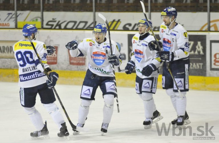 Jaroslav Markovič (druhý zľava) z MHC Mountfield Martin sa raduje z gólu počas 44. kola hokejovej Tipsport extraligy medzi Dukla Trenčín a MHC Mountfield Martin. Trenčín, 25. január 2015. Foto: SITA/Tomáš Somr