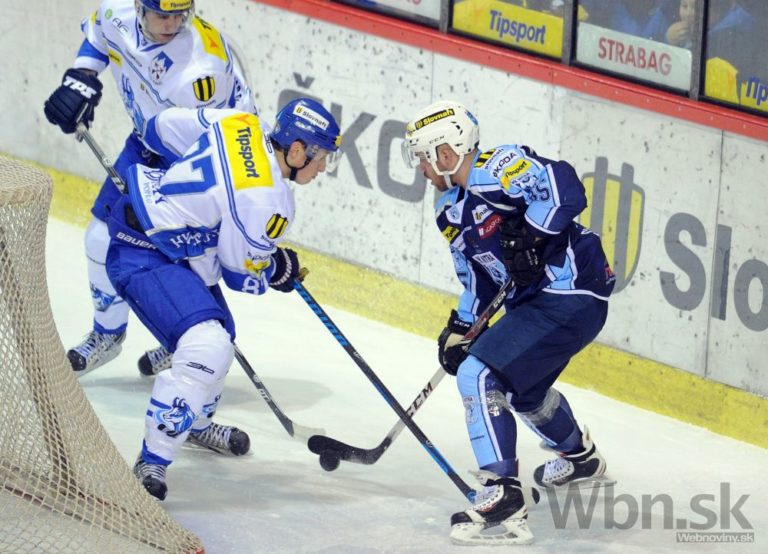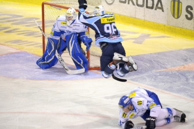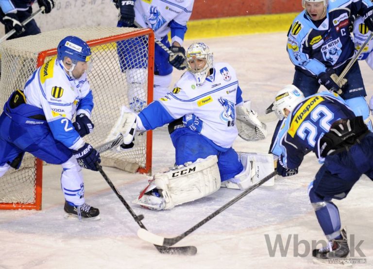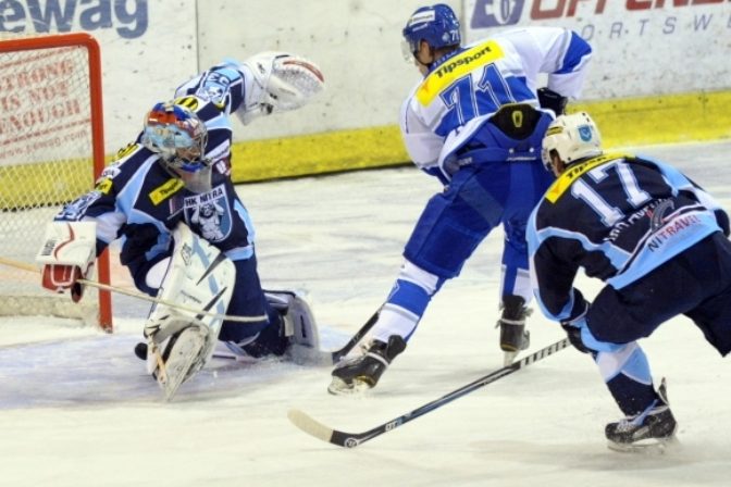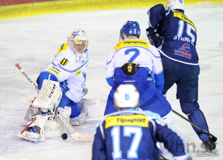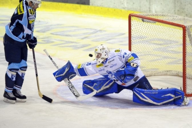 Brankár Matúš Kostúr z HK Poprad (vľavo) počas 46. kola slovenskej hokejovej Tipsport extraligy 2014/2015 medzi HK Nitra - HK Poprad. Nitra, 3. február 2015. Foto: SITA/Martin Havran
