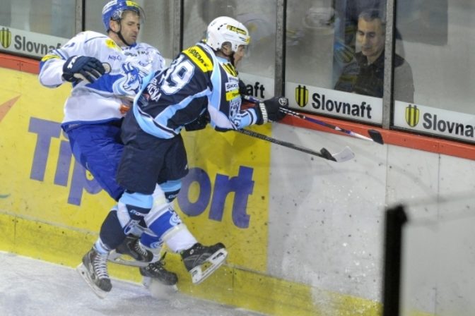 Marek Slovák z HK Nitra (vpravo) a Mário Kurali z HK Poprad (vľavo) počas 46. kola slovenskej hokejovej Tipsport extraligy 2014/2015 medzi HK Nitra - HK Poprad. Nitra, 3. február 2015. Foto: SITA/Martin Havran