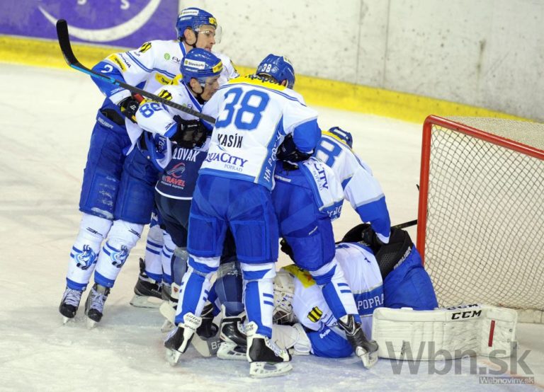 Marek Slovák z HK Nitra (v strede) v obkľúčení hráčov z HK Poprad počas 46. kola slovenskej hokejovej Tipsport extraligy 2014/2015 medzi HK Nitra - HK Poprad. Nitra, 3. február 2015. Foto: SITA/Martin Havran