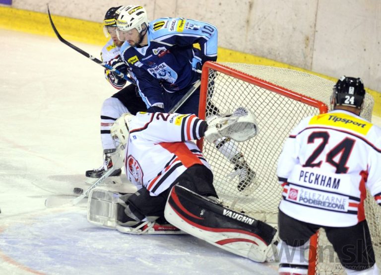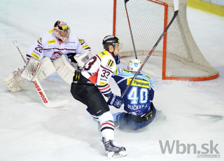 Henrich Ručkay z HK Nitra (vpravo) a brankár Andrej Košarišťan z HC '05 Banská Bystrica (vľavo) počas 42. kola slovenskej hokejovej Tipsport extraligy 2014/2015 medzi HK Nitra - HC '05 Banská Bystrica. Nitra, 18. január 2015. Foto: SITA/Martin Havran