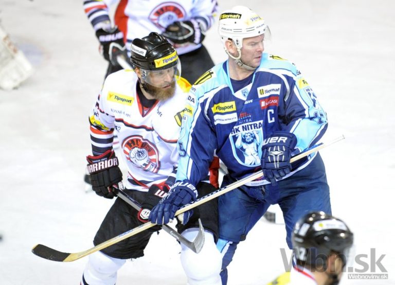 Branislav Mezei (vľavo) a Juraj štefanka (vpravo) z HK Nitra počas 42. kola slovenskej hokejovej Tipsport extraligy 2014/2015 medzi HK Nitra - HC '05 Banská Bystrica. Nitra, 18. január 2015. Foto: SITA/Martin Havran